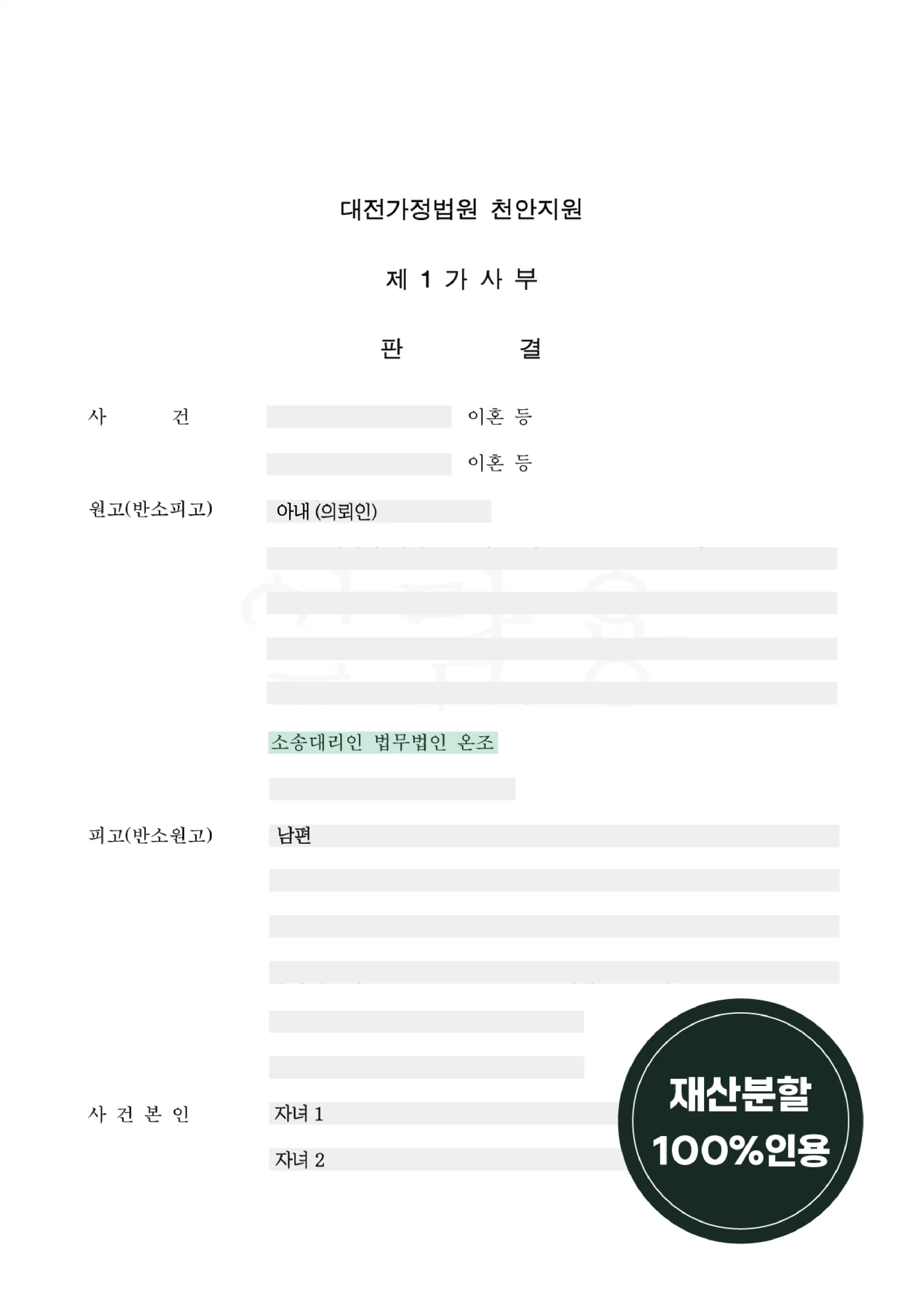 재산분할 청구금액 100% 인용이라는 결과를 얻을 수 있었습니다.