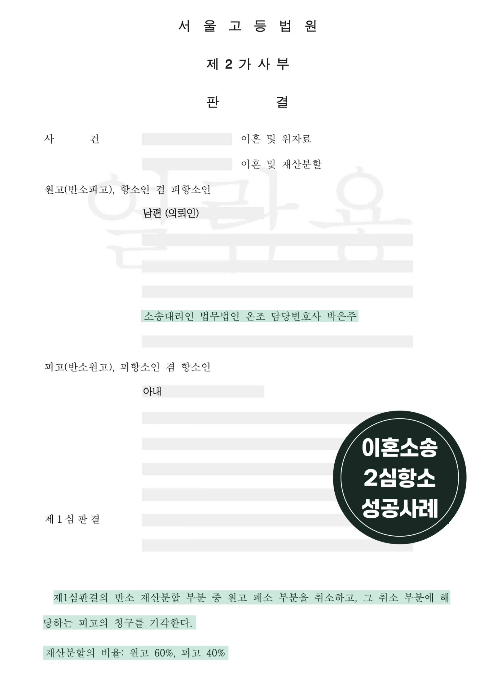 그 결과 상대방의 재산분할 기여도를 대폭 하향 조정하였고, 1심에서 인정되었던 분할 대상 재산 중 약 4억 원을 제외했습니다.