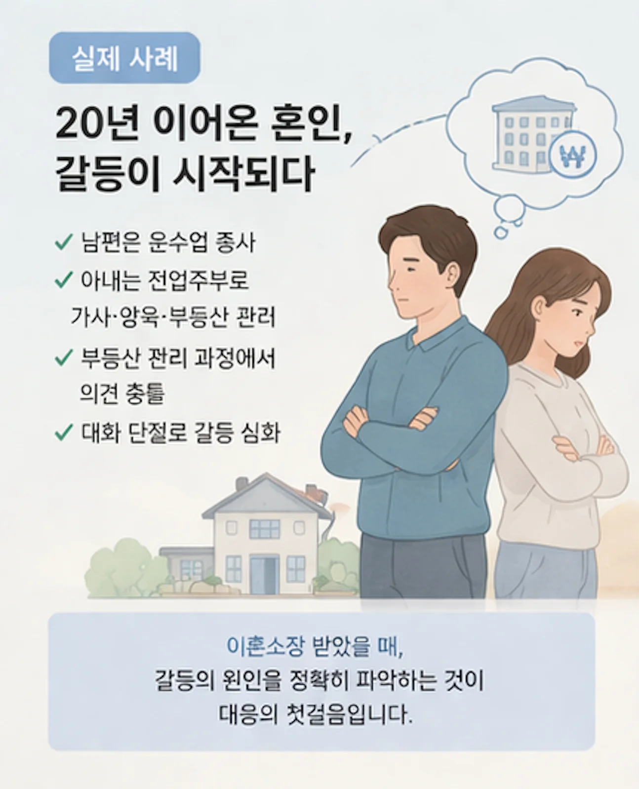 의뢰인은 20년 넘는 혼인 관계를 유지해온 아내로, 성인 자녀들을 둔 가정의 구성원이었습니다. 남편은 운수업에 종사했고, 의뢰인은 전업주부로서 가사와 양육, 그리고 부동산 관리까지 맡아왔습니다.