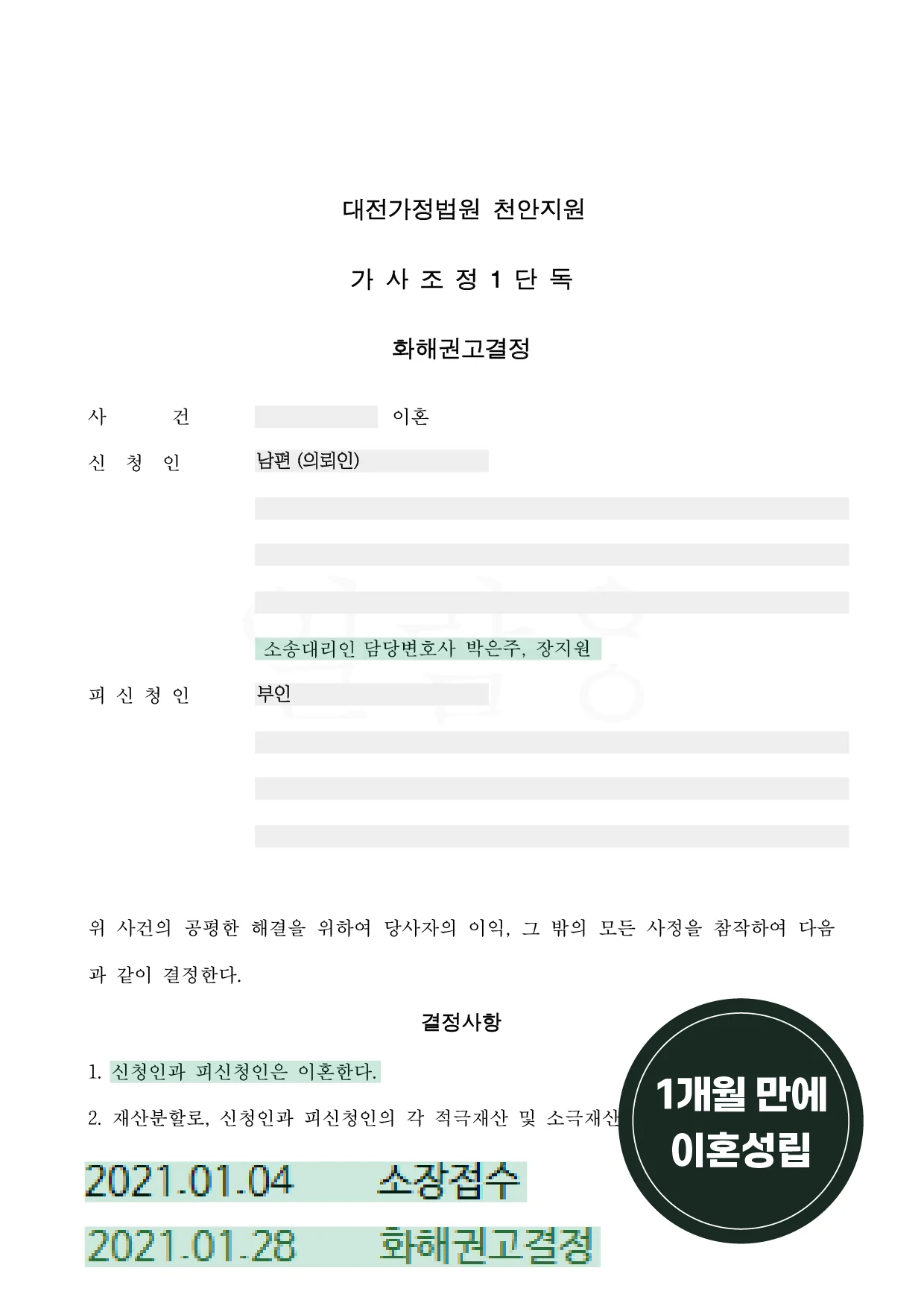 의뢰인의 상황과 사건의 특성을 고려한 결과, 조정 신청 후 약 30일 만에 이혼 절차가 마무리되었습니다.
