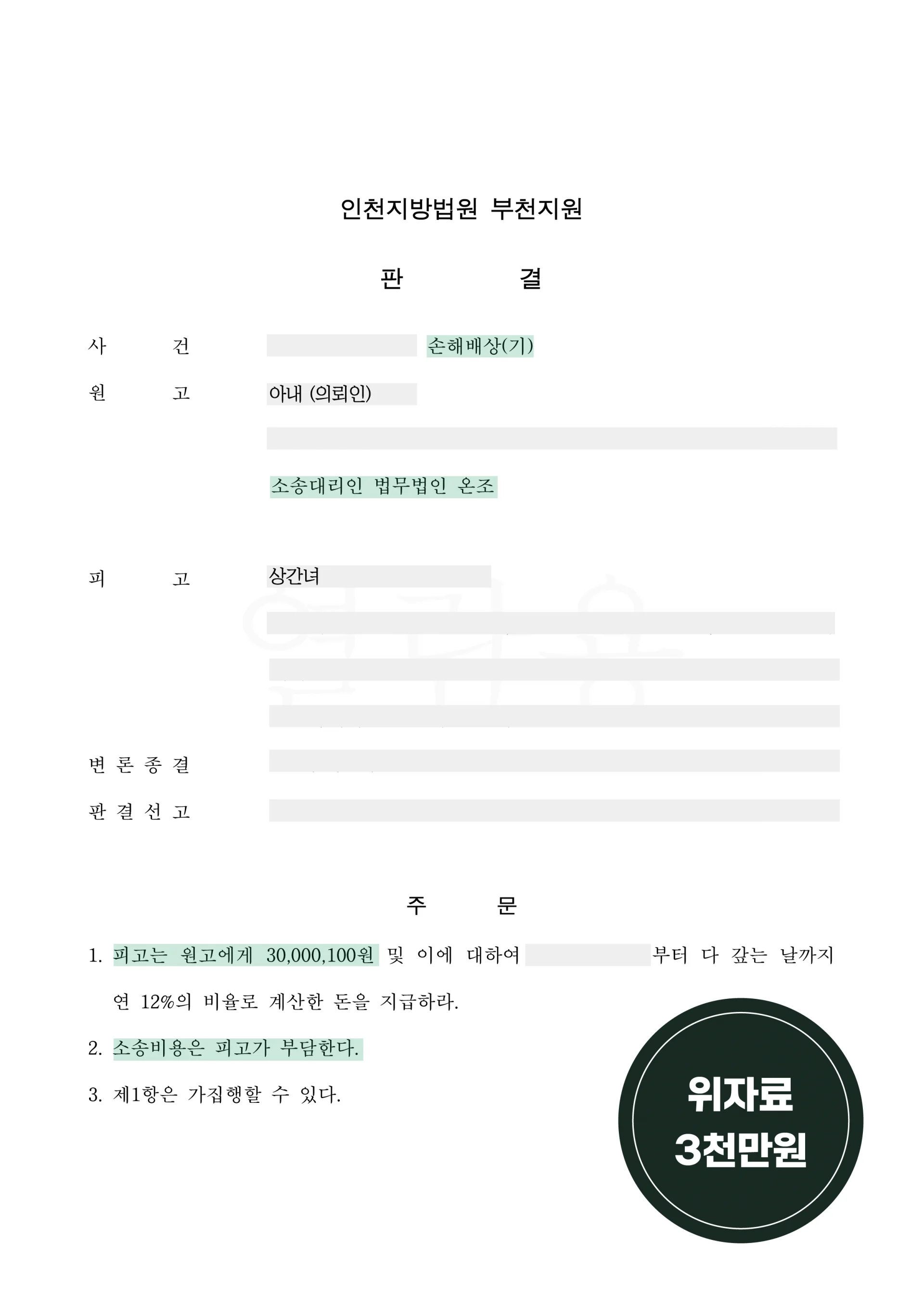 이러한 요소들이 모두 인정되면서 인천지방법원 부천지원 상간녀소송에서 3,000만 원의 위자료가 인정되었습니다. 이는 일반적인 수준보다 높은 결과라고 볼 수 있습니다.